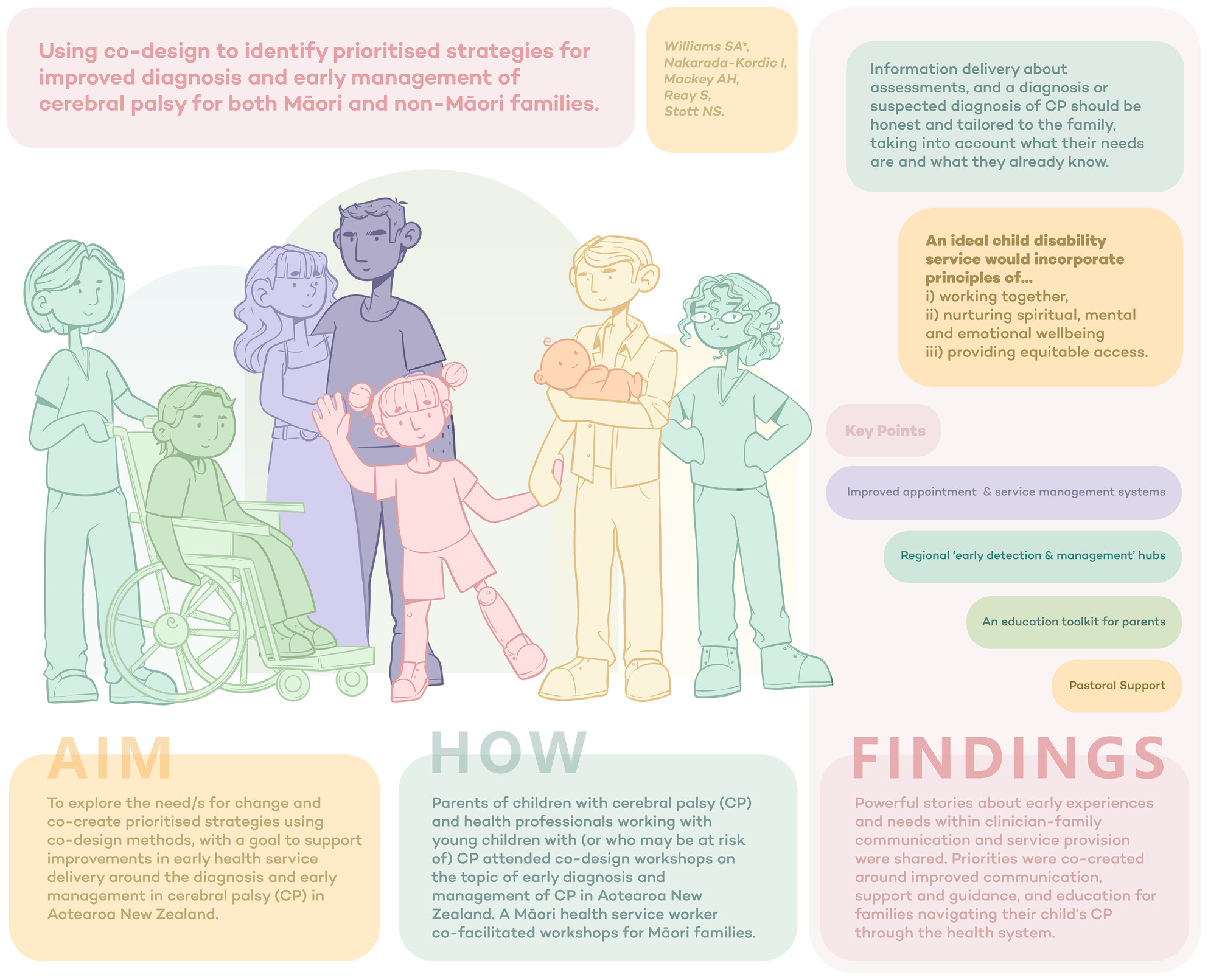 Four co-design workshops (7-13 participants each) were held and included 12 parents (children ranging GMFCS I-V, diagnosis received between 8-36 months of age) and 14 clinicians.